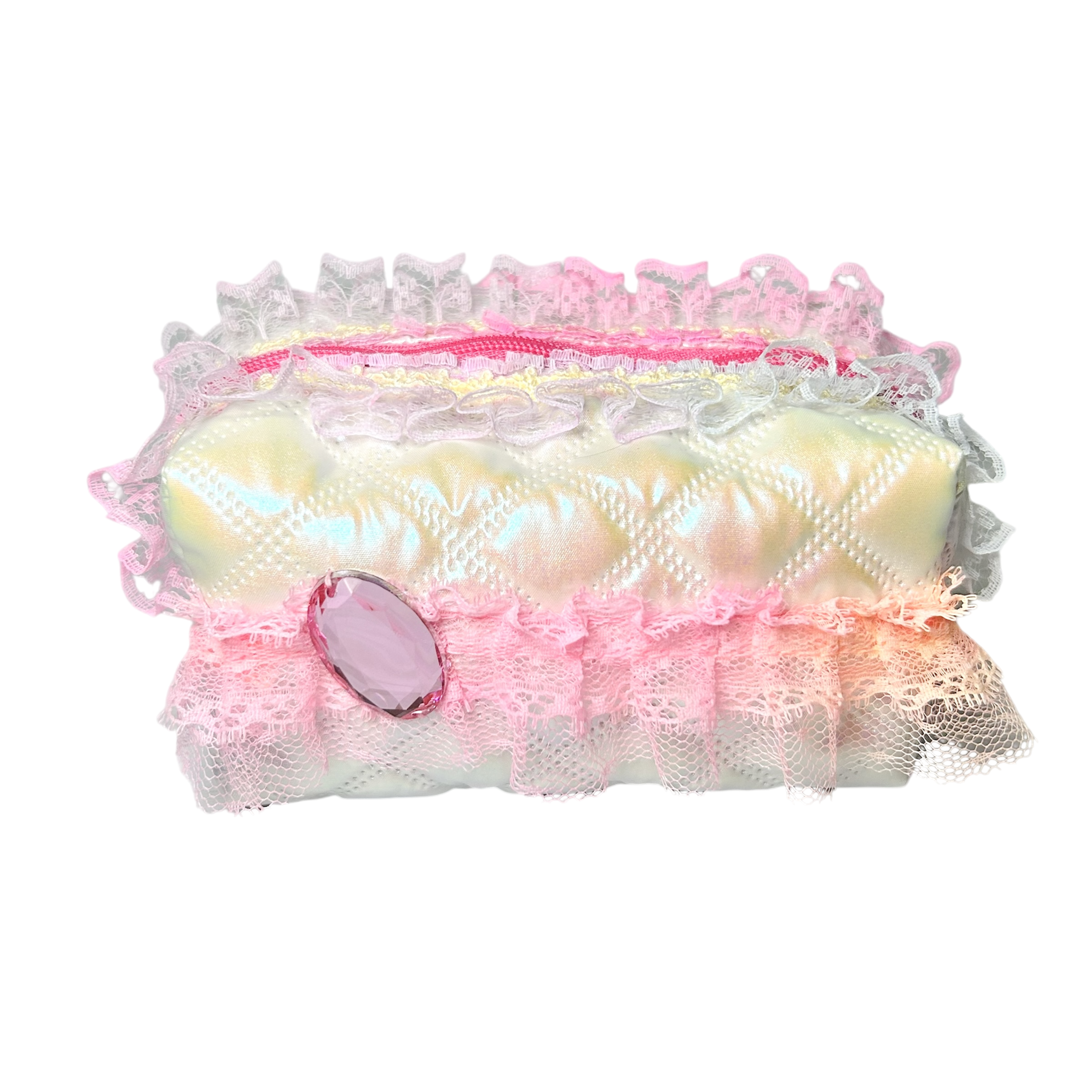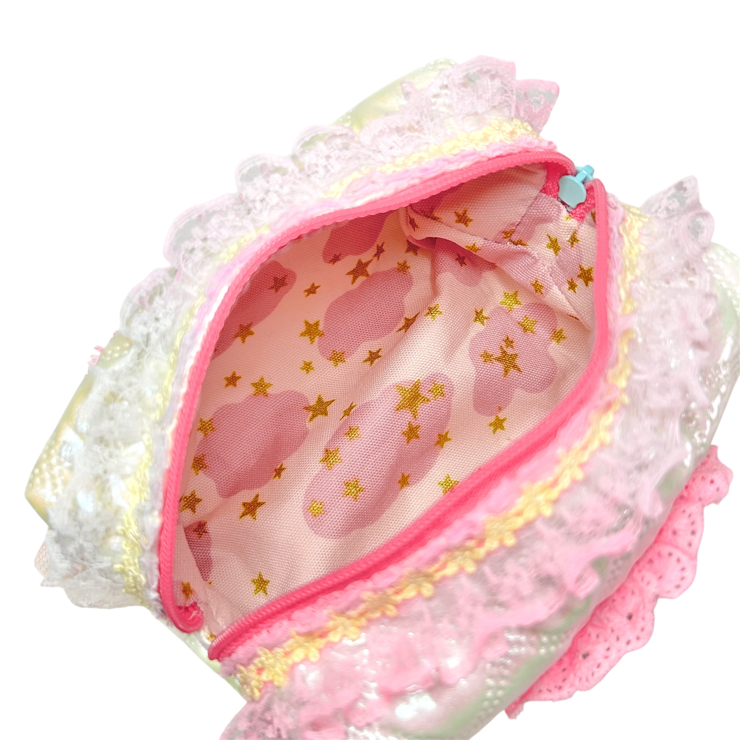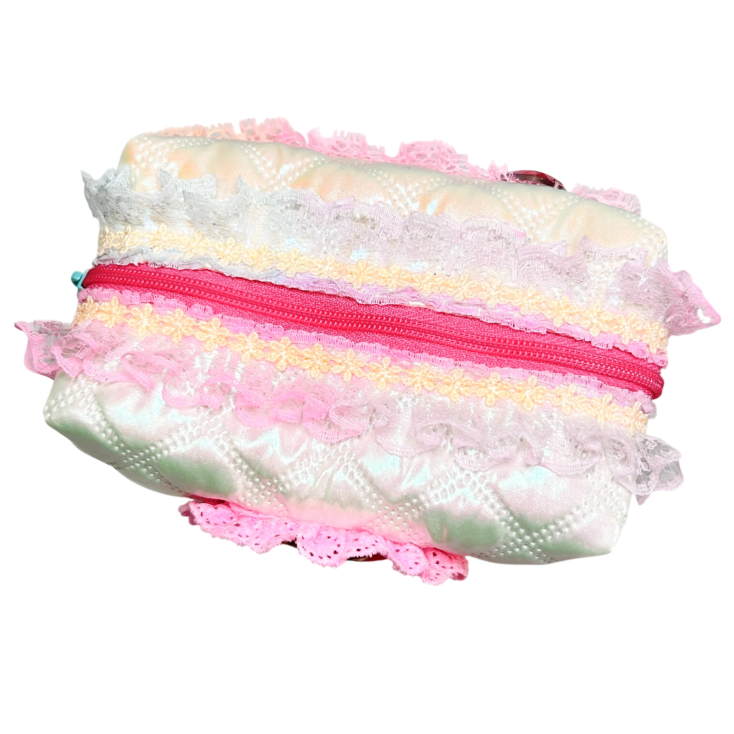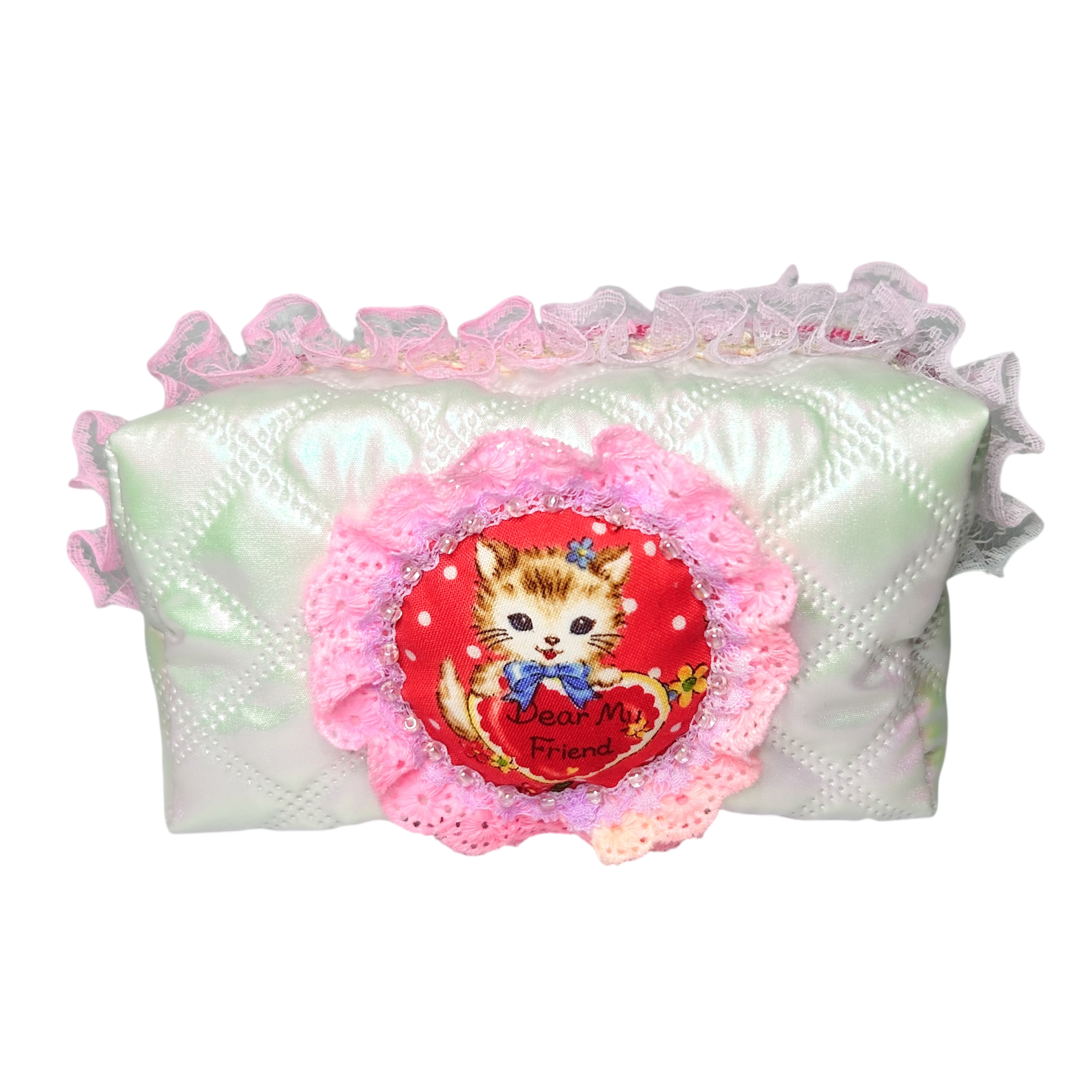 手染めレースたっぷり オーロラキルトポーチ ホワイト レトロねこ
