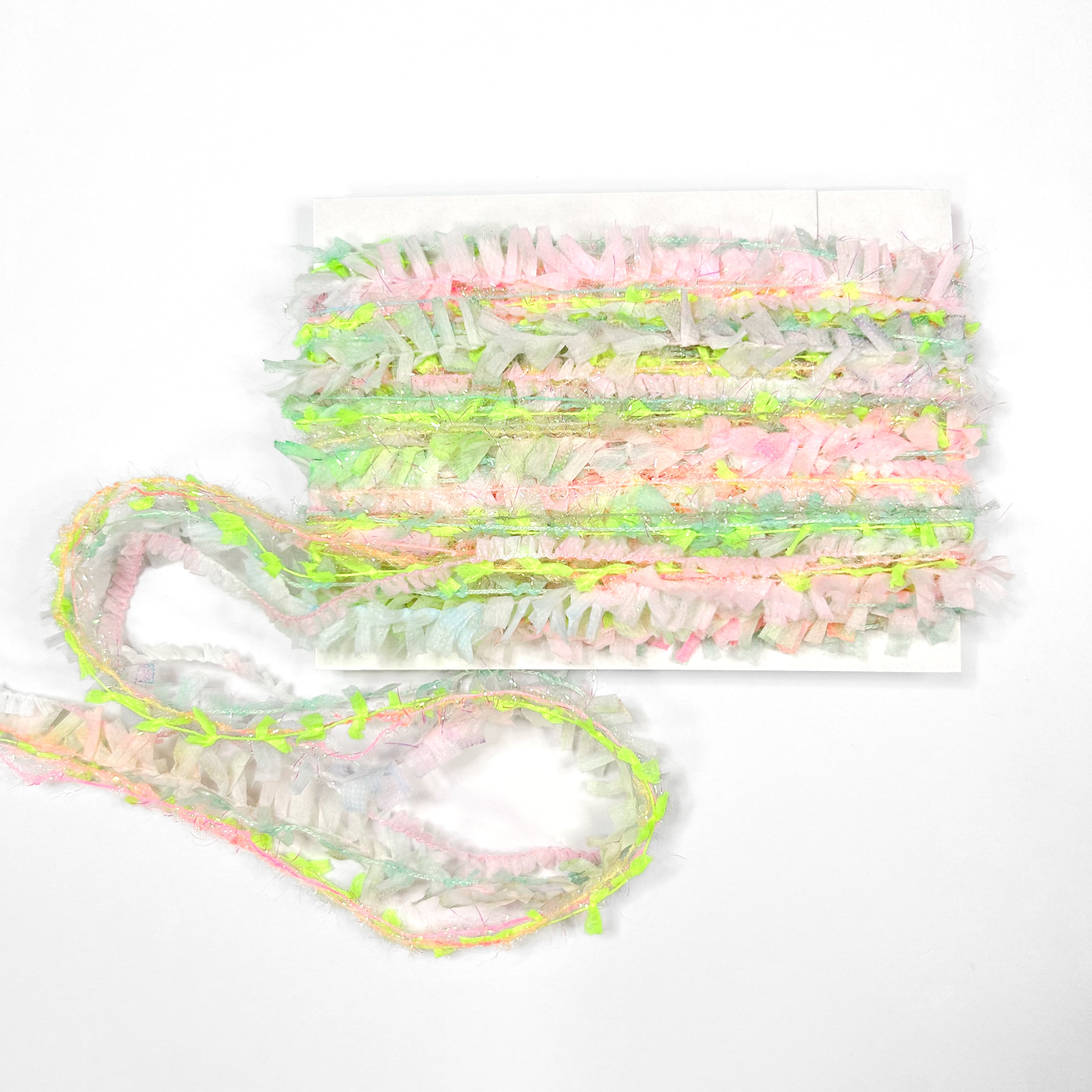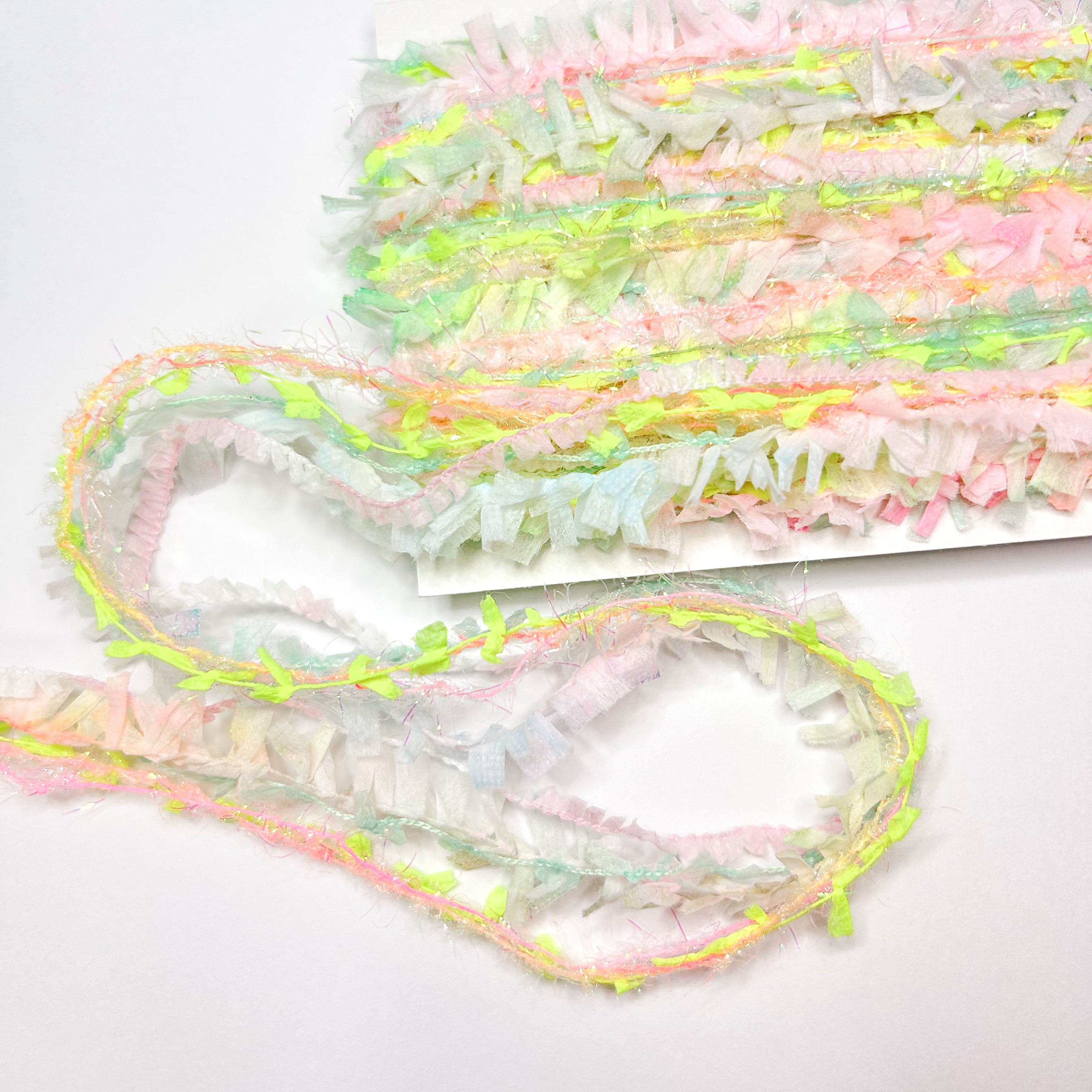 異素材の糸を5-6本で引き揃えています。素材により伸び縮みがありますので多少のたるみや長さの違いがございます。