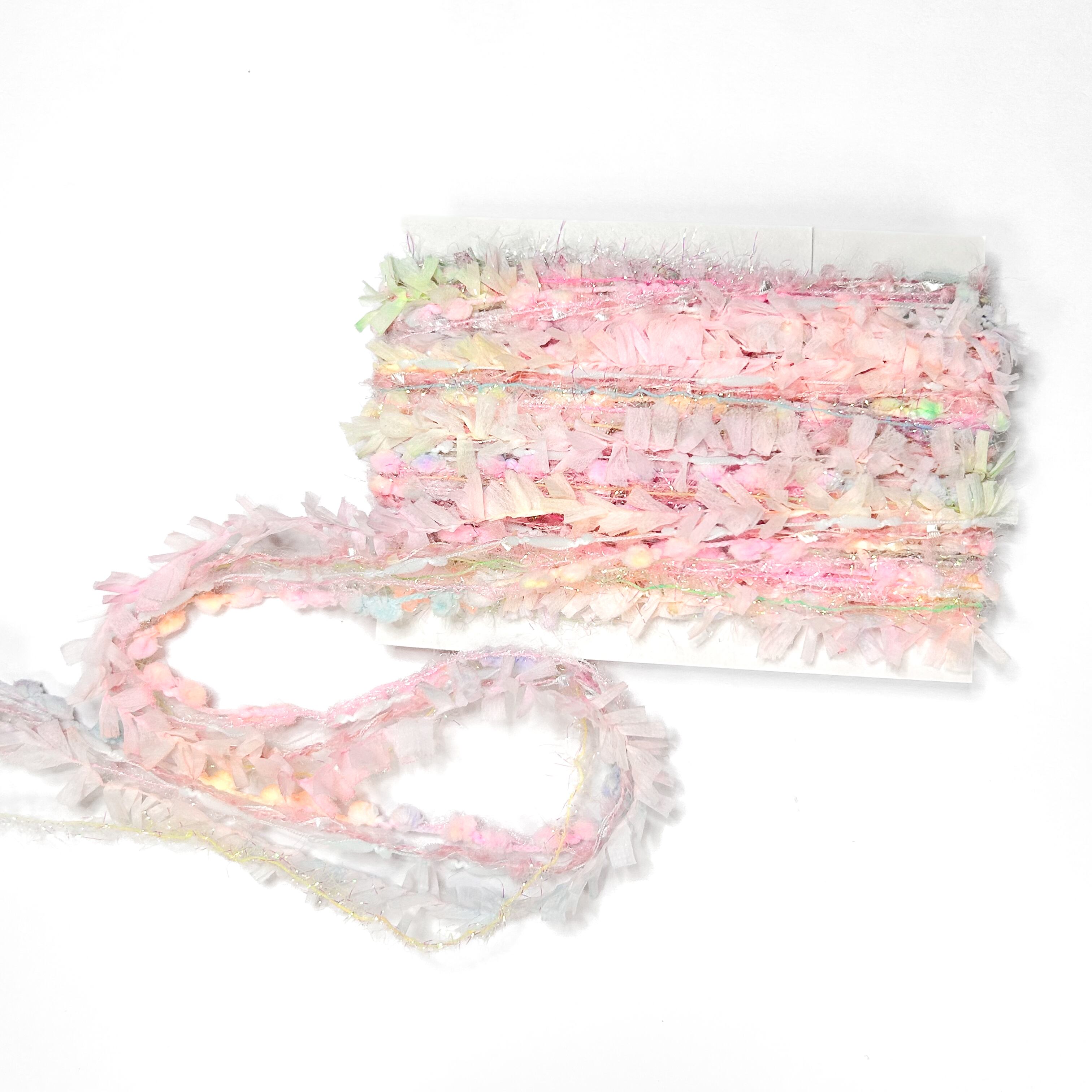 異素材の糸を5-6本で引き揃えています。素材により伸び縮みがありますので多少のたるみや長さの違いがございます。